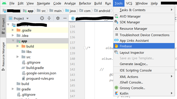 1. Adnroid Project 오픈 후, Tools의 Firebase Click!