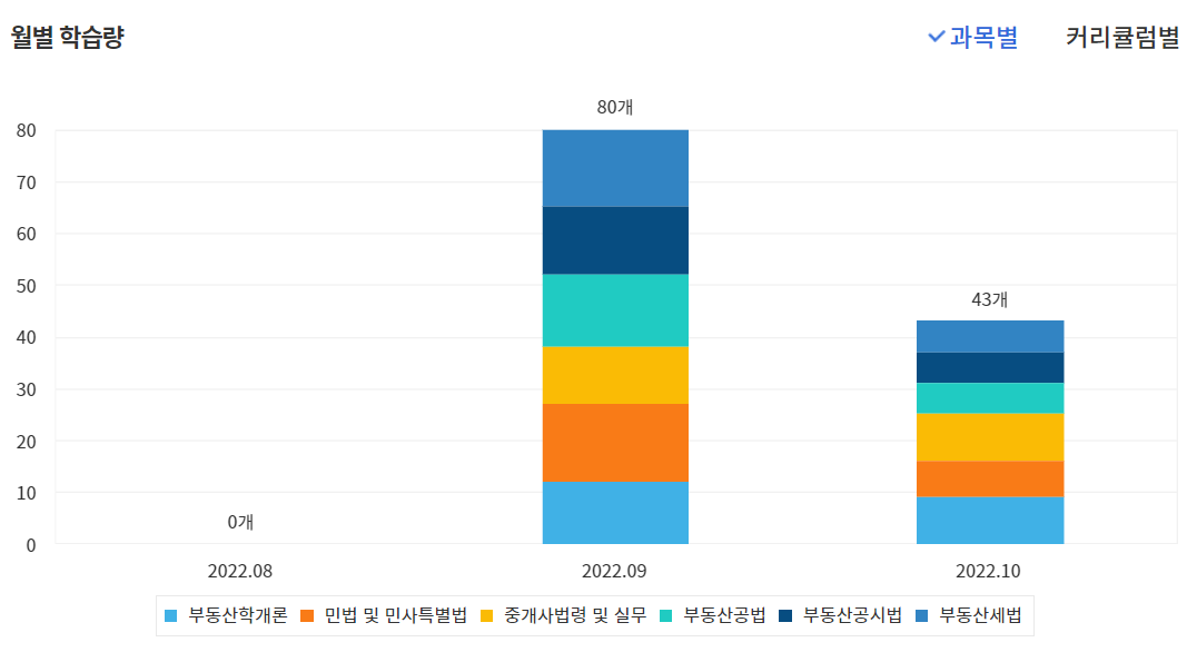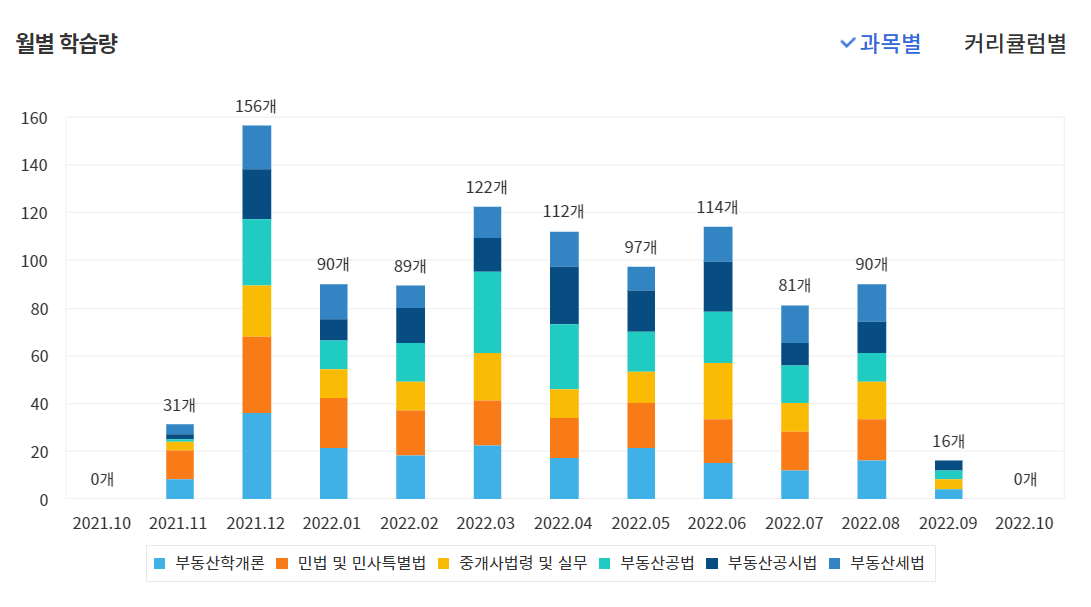 밑에는 나의 21.11~ 22.10 시험때까지의 월별 학습량이다. 밑의 사진들을 보면 그냥 A부터 Z까지 하나도 빠짐없이 강의를 들었다는것을 알 수 있다. 학원분들과 이런저런 얘기를 나누다보니까 느낀건데, 사람마다 공부할때 특화되는(?)부분이 있는거같다. 어떤분의 필기를 하며 공부하는것이 더 도움이 된다고 말하셨는데, 나는 필기보다는 눈으로 사진찍듯이 보는거랑 귀로 듣는게 더 기억에 잘 남고 효율적이라는 생각이 들었다. 공부를 하면서 자신이 어떻게 공부해야할지 생각하는것도 꽤 중요하다고 느꼈다. 이 부분에서 갈피를 잡지 못하면 공부하는데 꽤 어려움을 겪을 수 있다는 생각이 들었다.